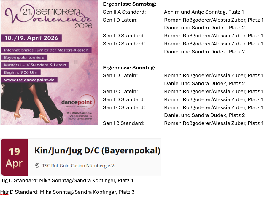 Apr.192026Mega-Wochenende im TSC Pocking. Die Turniere in Königsbrunn und Fürth wurden für die Paare des Vereins zur Quelle für erste und zweite Plätze. Alle Erfolge zählen für den Bayernpokal, der für damit in greifbare Nähe gerückt ist! 19. April 2026KommentarnavigationZurückVorheriger Beitrag:Ostern 2026Ähnliche BeiträgeSieg und Aufstieg !28. Februar 2026Überflieger – Turnierstarter räumen ab24. November 2025Erstes Turnier – perfekter Einstieg5. Oktober 2025TSC-Paar trainiert bei Weltmeistern14. Januar 2025Platz 2 im Bayernpokal1. Dezember 2024Teil des weltgrößten Tanzturniers25. August 2024