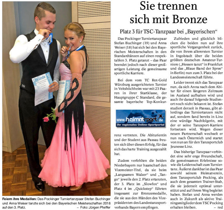 Juni182018Großer Dank gilt der Heimatsportredaktion der Passauer Neuen Presse für den schönen Bericht. 18. Juni 2018KommentarnavigationZurückVorheriger Beitrag:Einladung zum Bürgerfest 2018NächstesNächster Beitrag:Ausflug statt TanzenÄhnliche BeiträgeÜberflieger – Turnierstarter räumen ab24. November 2025Erstes Turnier – perfekter Einstieg5. Oktober 2025TSC Pocking auf Vereinsausflug nach Schloss Katzenberg in Österreich1. Juli 2025Ehrungen bei der ordentlichen Mitgliederversammlung25. März 2025TSC-Paar trainiert bei Weltmeistern14. Januar 2025Platz 2 im Bayernpokal1. Dezember 2024