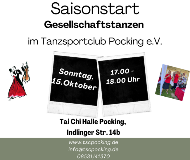 Der Sommer ist vorbei und nach der Hitze gibt es wieder Lust auf Bewegung! Deswegen als Single oder Paar, ob als Anfänger oder Wiedereinsteiger – im Tanzsportclub Pocking wird getanzt. Der TSC Pocking bietet am Sonntag, 22. September ab 18:15 Uhr in der Tai Chi Halle Pocking, Indlinger Str. 14b für Interessierte die Möglichkeit eines…