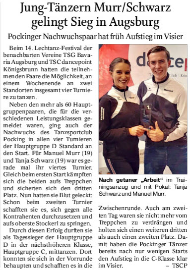 Okt.192018 (Quelle: PNP vom 19.10.2018) 19. Oktober 2018KommentarnavigationZurückVorheriger Beitrag:Maria und Jürgen auf Bayernpokal-KursNächstesNächster Beitrag:Nikolaus schon frühzeitig beim TSCÄhnliche BeiträgeÜberflieger – Turnierstarter räumen ab24. November 2025Erstes Turnier – perfekter Einstieg5. Oktober 2025TSC-Paar trainiert bei Weltmeistern14. Januar 2025Platz 2 im Bayernpokal1. Dezember 2024Teil des weltgrößten Tanzturniers25. August 2024Aufstieg in die B-Klasse29. Juli 2024